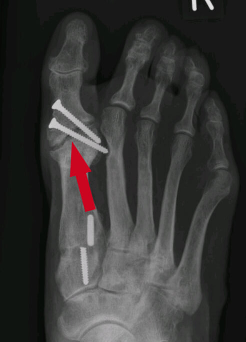De bedoeling van de operatie was om het gewricht van de grote teen (het MTP-I-gewricht) vast te zetten. Het (resterende) kraakbeen is uit het gewricht gehaald en de botdelen zijn aan elkaar vastgezet met schroeven of met een plaat en schroeven. Daarna moeten de botdelen aan elkaar vastgroeien. Soms groeien de botdelen niet (goed) aan elkaar. Vlak na de operatie, wanneer de voet nog in het gips zit, geeft dit meestal nog geen klachten, maar in de loop van de tijd gaan de schroeven steeds losser in het bot zitten en kunnen de botdelen weer een beetje gaan bewegen. Zodra de voet een paar dagen uit het gips is, gaat de grote teen pijn doen, en zwelt deze op.