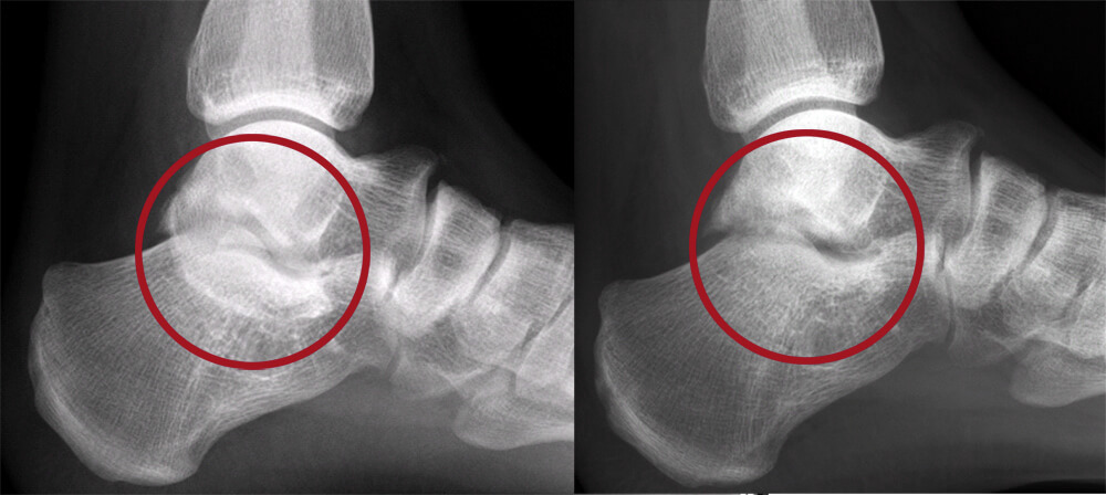 Bij deze patiënt is de vergroeiing tussen het sprongbeen en het hielbeen operatief verwijderd.